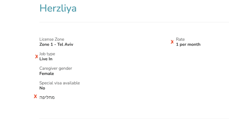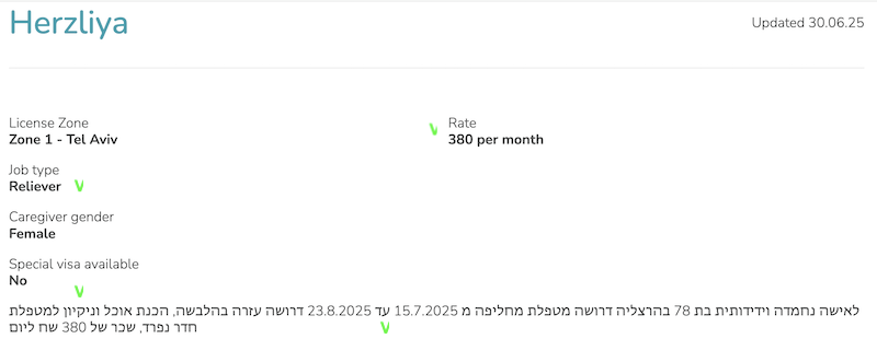 - השכר המוצע הינו 1 שח. בני משפחה רבים חושבים שזה יהיה ברור למטפלים שזה לא השכר האמיתי, אך בפועל זה מוריד את הסיכוי לקבל פניות. יש לפרסם את השכר האמיתי שאתם מוכנים לשלם, לפי יום. הטווח כיום נע בין 360 שח ל 450 שח ליום